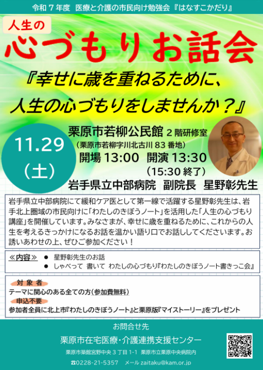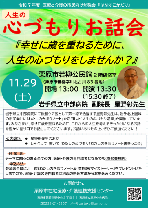 講師には、岩手県立中部病院 副院長 星野彰先生をお迎えし、『幸せに歳を重ねるために、人生の心づもりをしませんか?』をテーマにお話を頂戴いたします。そして、岩手県北上市が作成した「わたしのきぼうノート」を使用して「わたしのきぼうノート書きっこ会」を行います。テーマに関心のある市民と医療と介護の専門職者とがいっしょになって人生の心づもりについて深めてまいりましょう!